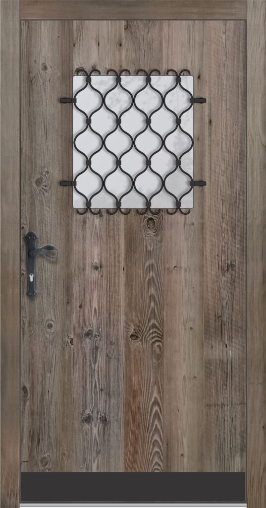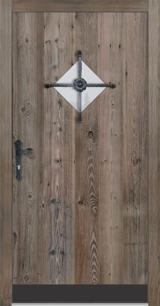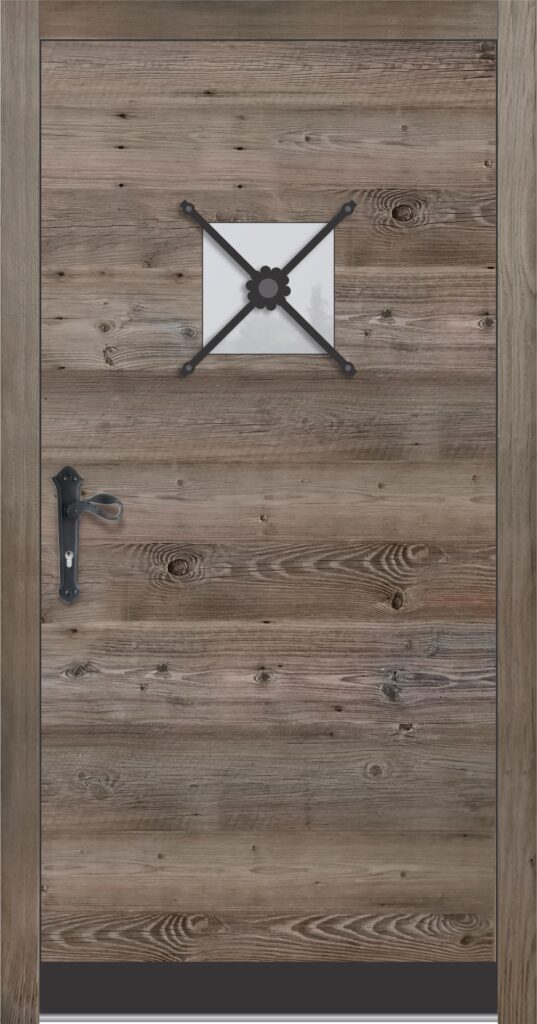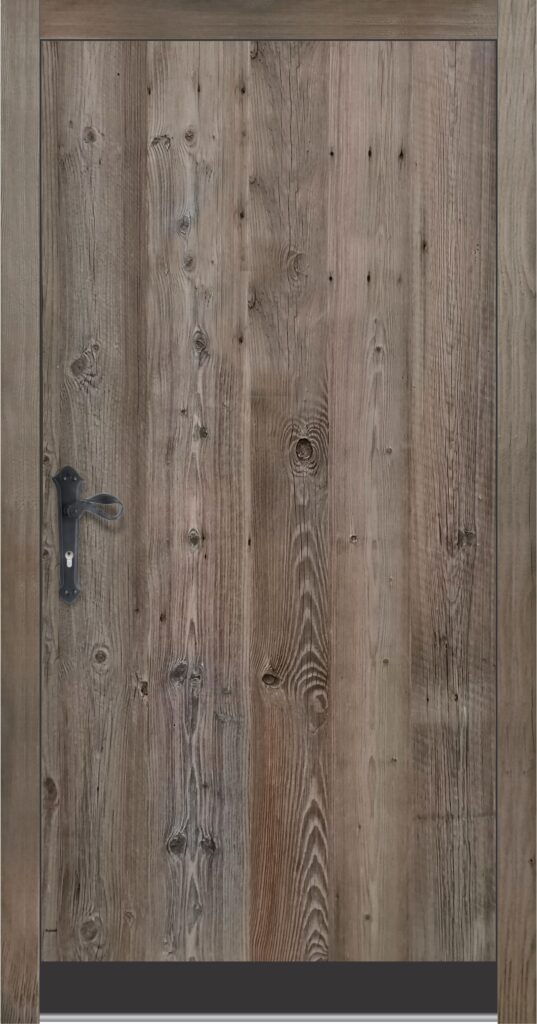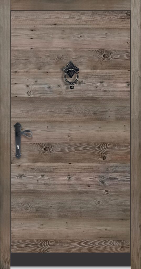 Zunanjost je obdelana s starano leseno ploščo v sivkastem ali brezbarvnem tonu, kar daje vratom pristno rustikalno noto.