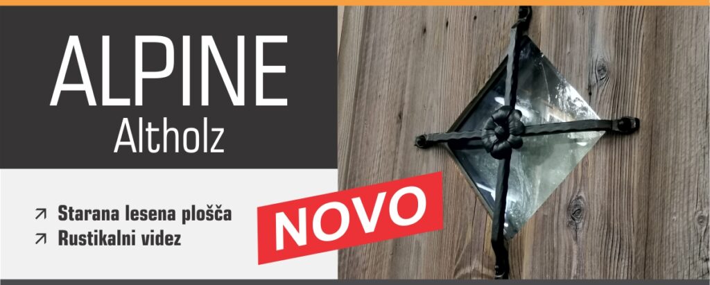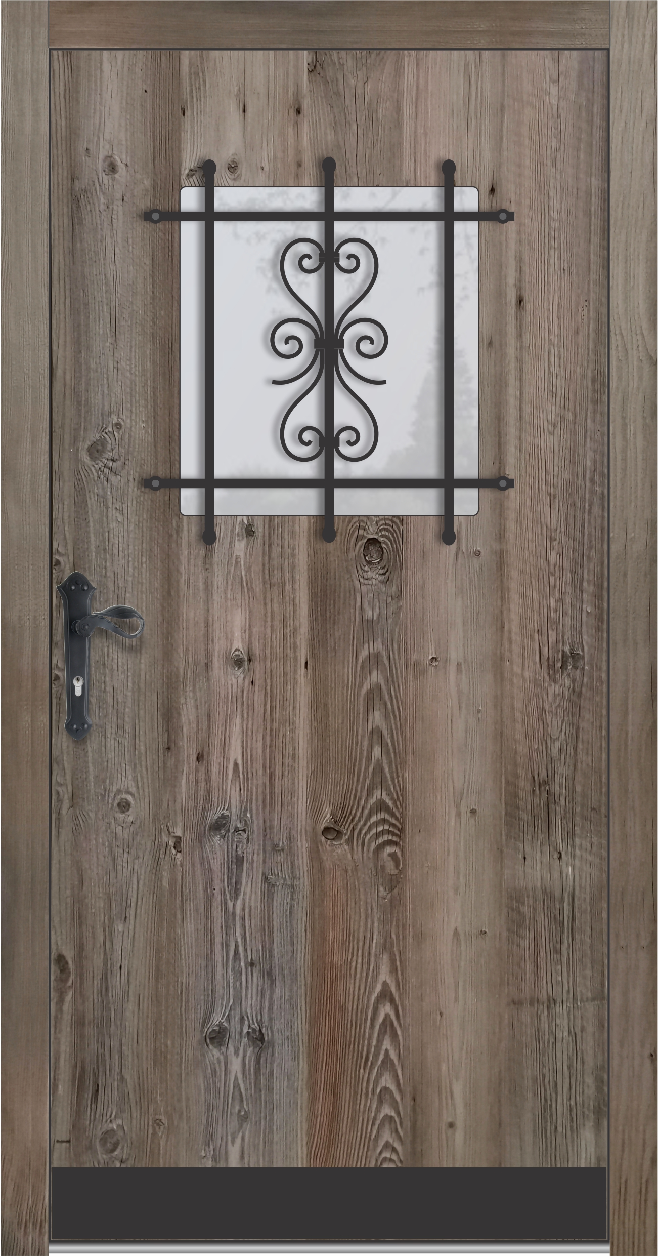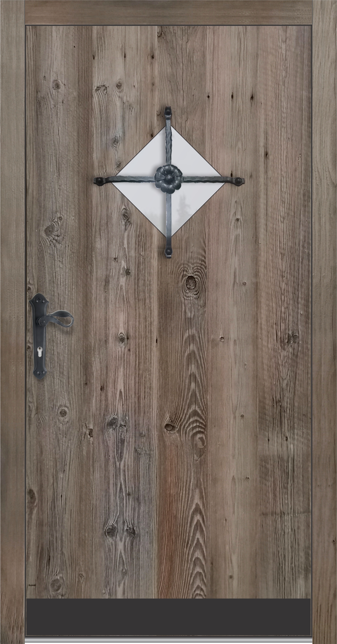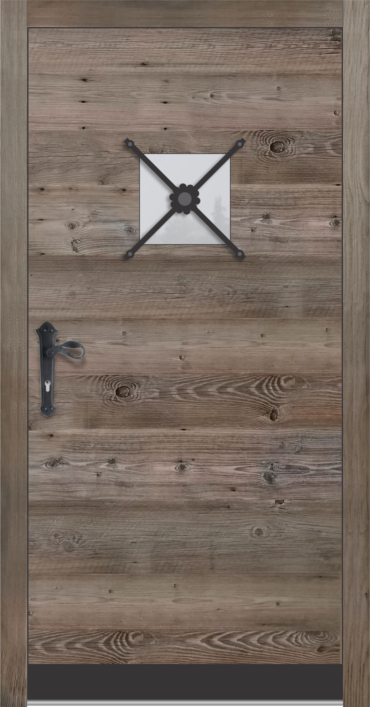 Zunanjost je obdelana s starano leseno ploščo v sivkastem ali brezbarvnem tonu, kar daje vratom pristno rustikalno noto.